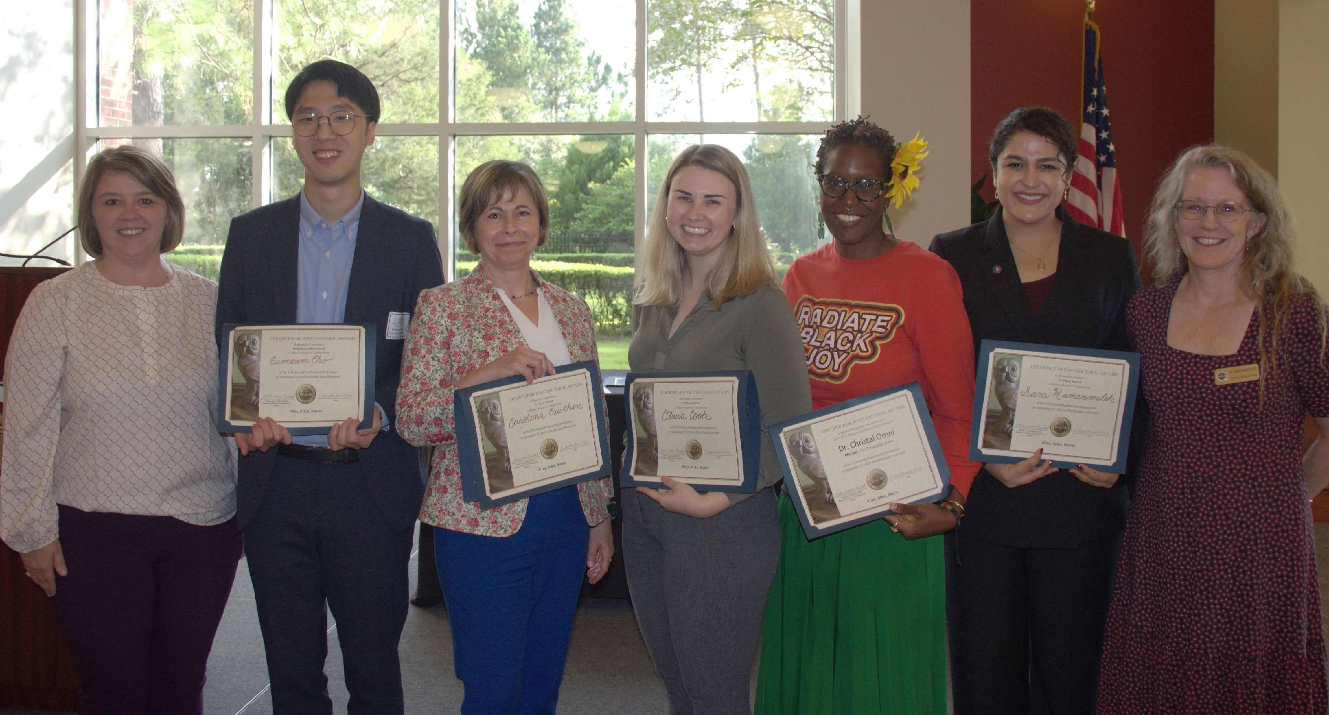 Left to right: Stacey Patterson (VP for Research), Eunsaem Cho (Peoples Choice), Carolina Cawthon (1st Place), Olivia Cook (2nd Place), Chris Omni (2nd Place), Sara Kamanmalek (3rd Place), Debra Fadool (Director, OPDA).