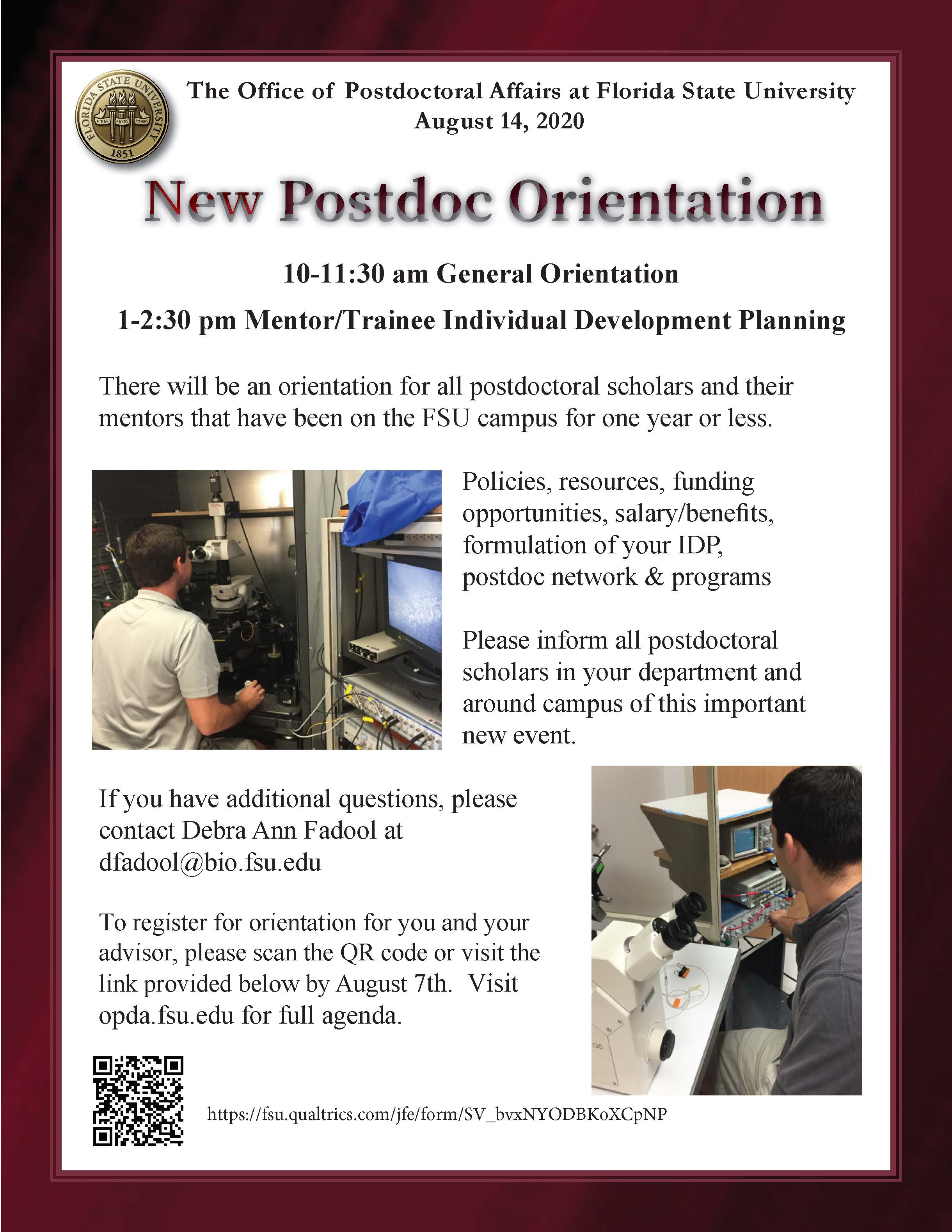 There is typically an evening social hosted by the PDA on the evening of the New Postdoctoral Orientation - request to join the "FSU Postdocs" WhatsApp Channel to be fully connected to your postdoc peers.