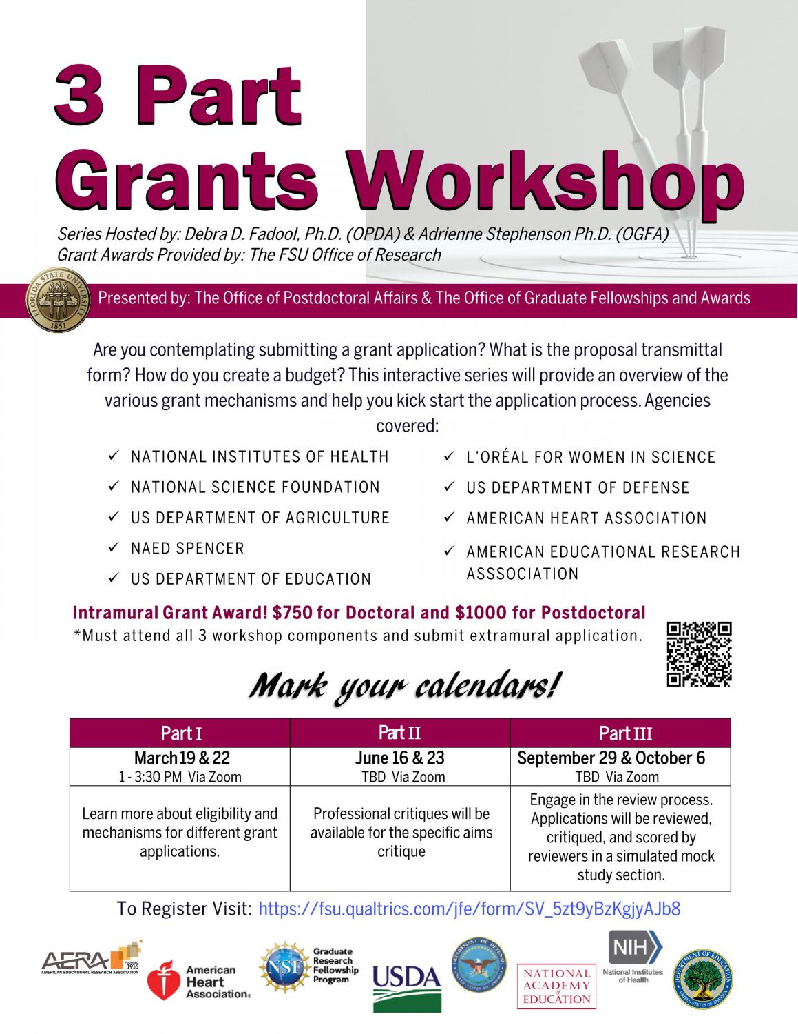 The Office of Postdoctoral Affairs and the Office of Graduate Fellowships and Awards are teaming together to sponsor a three-part grants workshop during which both postdoctoral scholars and doctoral students will have the opportunity to be provided 1) an overview of potential mechanisms that would be suitable for their type of research, 2) have an opportunity to get their specific aims critiqued and have guidance through all the form pages and supplemental material, and 3) participate in a mock study section by experts in their field and ability to discuss the strengths and pitfalls with FSU doctoral and postdoctoral scholars that have successfully acquired that mechanism. The mock study section will identify top proposals and those individuals will be supported by an intramural award administered by FSU following submission of their proposal to a federal agency or private foundation. Postdoctoral submissions will be judged by the mock study section to receive up to $1500 of support. Participants must complete all three workshops to be eligible for the intramural award.