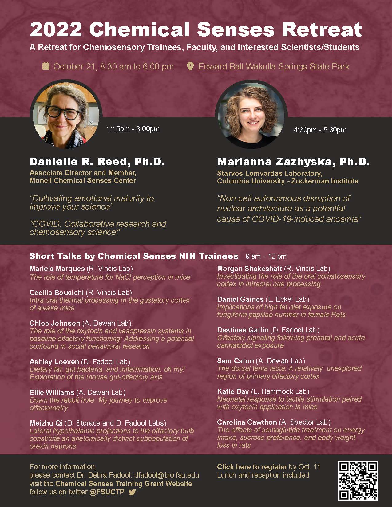 There was a fall Chemosensory Training Grant Retreat at Wakulla Springs State Park at the Edward Ball Lodge. The event was for our chemosensory trainees (postdoctoral and predoctoral), faculty, postdoctoral scholars, interested scientists and FSU scholars, and students in our new undergraduate Neuroscience Degree Program. Members of the Program in Neuroscience, Biomedical Science, Biological Science, and Institute of Molecular Biophysics communities are encouraged to attend. Everyone with an interest in chemosensory research (and desire to learn more about the intersection between Covid and Chemosensory loss) was welcomed. The morning was dedicated to 12-minute progress reports from our doctoral and postdoctoral trainees that cover the physiology, behavior, molecular, or psychophysical explorations of olfaction, taste, ingestive or innate behaviors. We had a picnic lunch on the deck outside the pavilion. Dr. Danielle Reed, Assistant Director of the Monell Chemical Senses Center in Philadelphia gave a professional development talk - "Cultivating your emotional maturity to improve your science" followed by a primer on Covid and chemosensory loss - "COVID - Collaborative science and chemosensory science". We enjoyed a one hour river cruise for the late afternoon. We returned for a special keynote address by Dr. Marianna Zazhyska from the Zuckerman Institute, Columbia University - "Non-cell-autonomous disruption of nuclear architecture as a potential cause of COVID-19-induced anosmia”. An excerpt describing the lectures can be found below.
