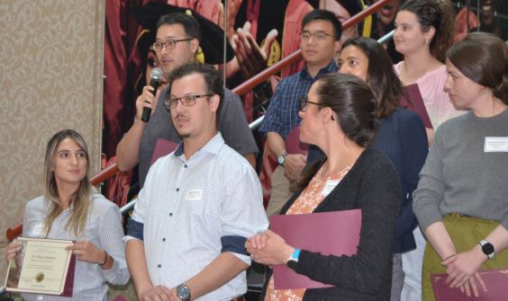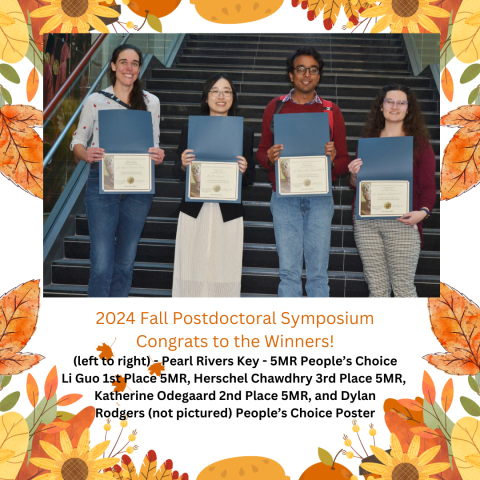 As part of the Fall Postdoctoral Symposium and National Postdoctoral Appreciation Week, scholars were judged in 3 different divisions ($100 award checks to the top presenters) including a People's Choice Award. We extend our congratulations to the following award winners! (left to right) -