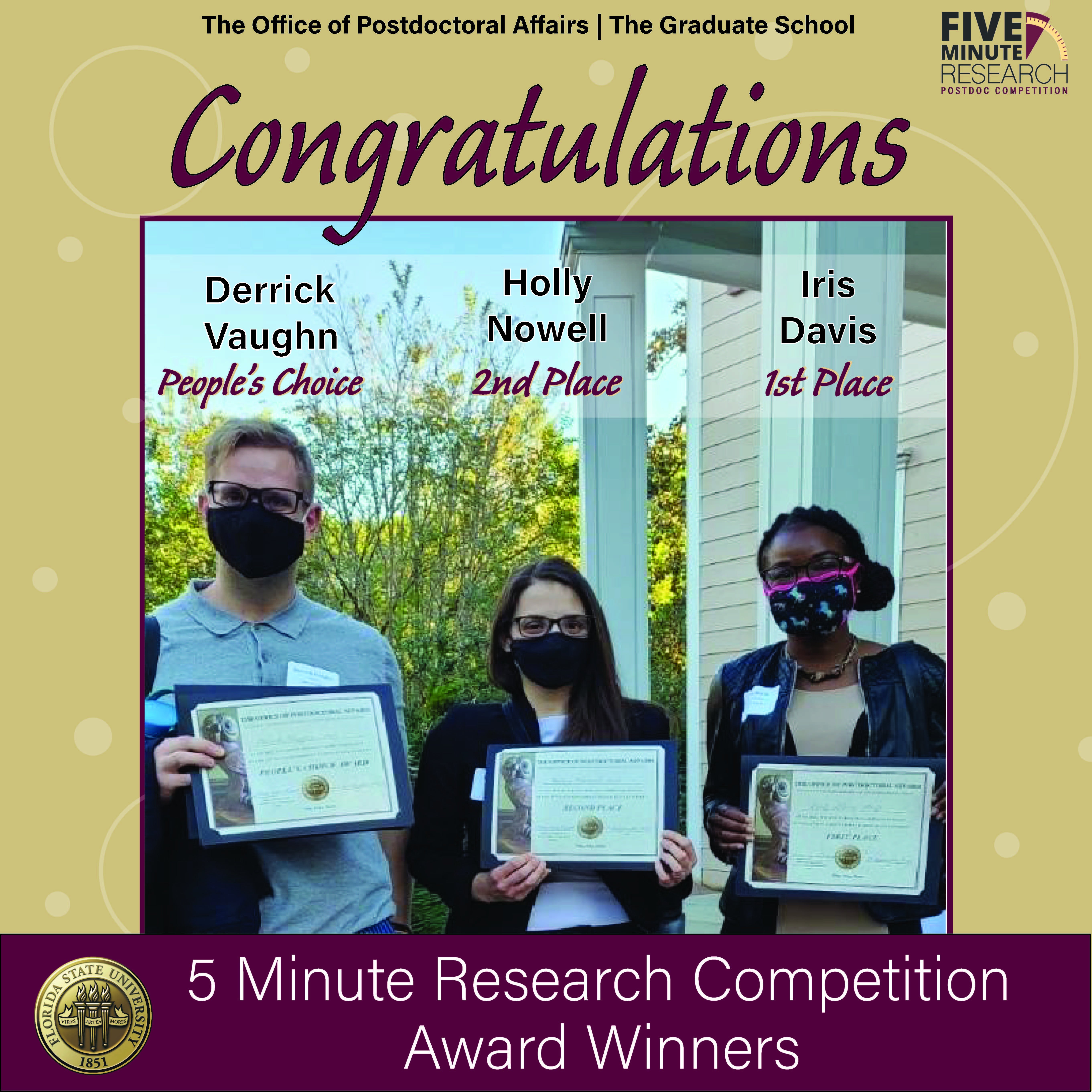 Congratulations to the 2022 Five Minute Research (5MR) winners! On Friday, September 23, the Office of Postdoctoral Affairs sponsored the fifth annual 5MR competition in conjunction with the annual National Postdoctoral Appreciation Week September 19 - 23. Twelve postdoctoral researchers from a variety of departments and colleges around FSU shared their research with their peers and a panel of judges.